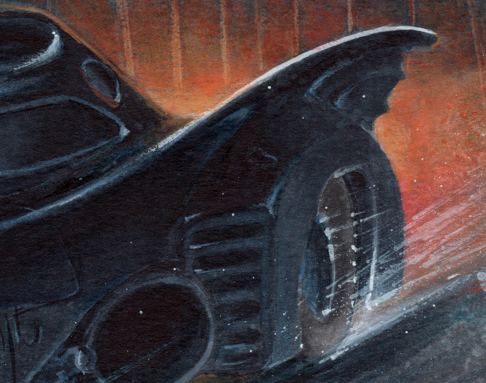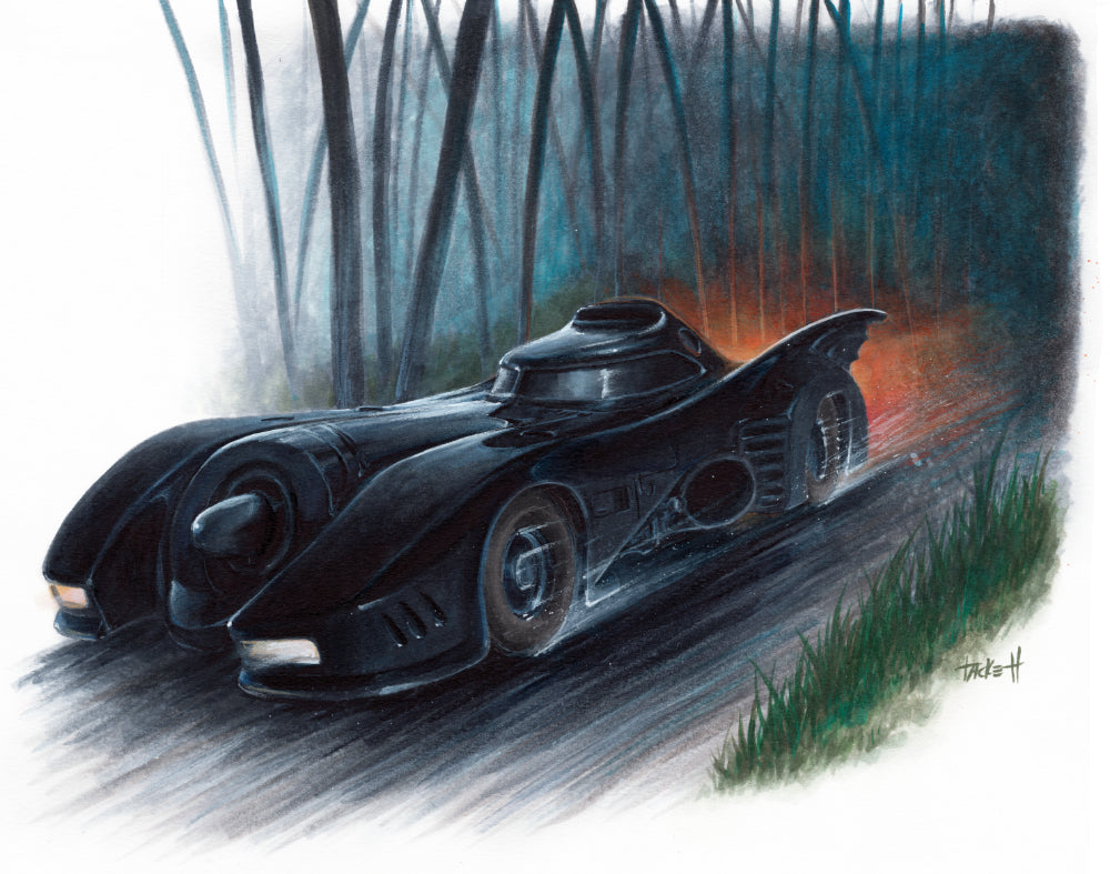 Introducing an exhilarating piece by award-winning artist Billy Tackett: a stunning painting of the iconic Batmobile from Tim Burton's 1989 film "Batman." This dynamic artwork captures a sense of motion and mystery that is quintessentially Gotham.