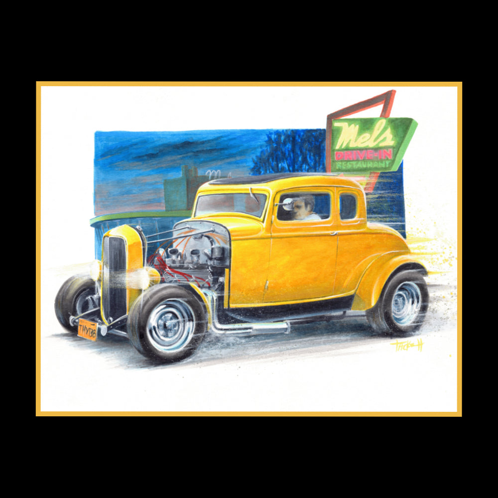 In this captivating masterpiece, the spirit of "American Graffiti" comes alive as the legendary 1932 Ford Deuce Coupe, owned by the unforgettable character John Milner, takes center stage on the canvas. The painting pays homage to the iconic car that became a symbol of rebellious youth and timeless coolness in George Lucas's iconic coming-of-age film.