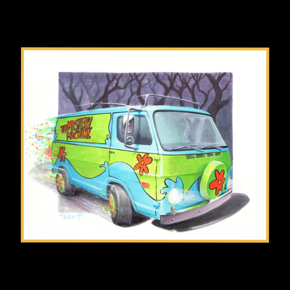 Step into a world of nostalgia and mystery with this captivating painting featuring none other than Scooby-Doo's iconic Mystery Machine. With a masterful blend of vibrant colors and intricate detailing, the artwork brings to life the beloved van that has been a staple of countless spooky adventures. The exterior of the van radiates a sense of endless summer, while every brushstroke highlights the well-known flower power motifs that adorn its surface.