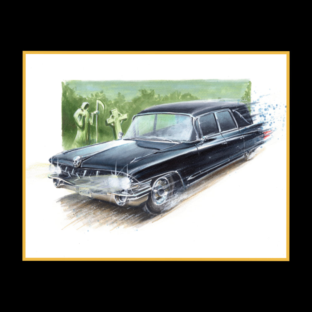 Unleash the dark allure of cinematic horror with my captivating painting of Dracula's 1961 Cadillac Hearse from the iconic film "The Monster Squad."