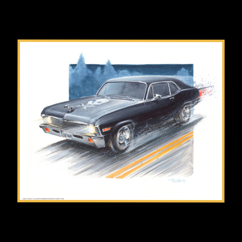 Mike the Stuntman's Nova from Quentin Tarantino's thrilling film "Death Proof" is now immortalized in a captivating painting that encapsulates the adrenaline rush and cinematic intensity of this cult classic.