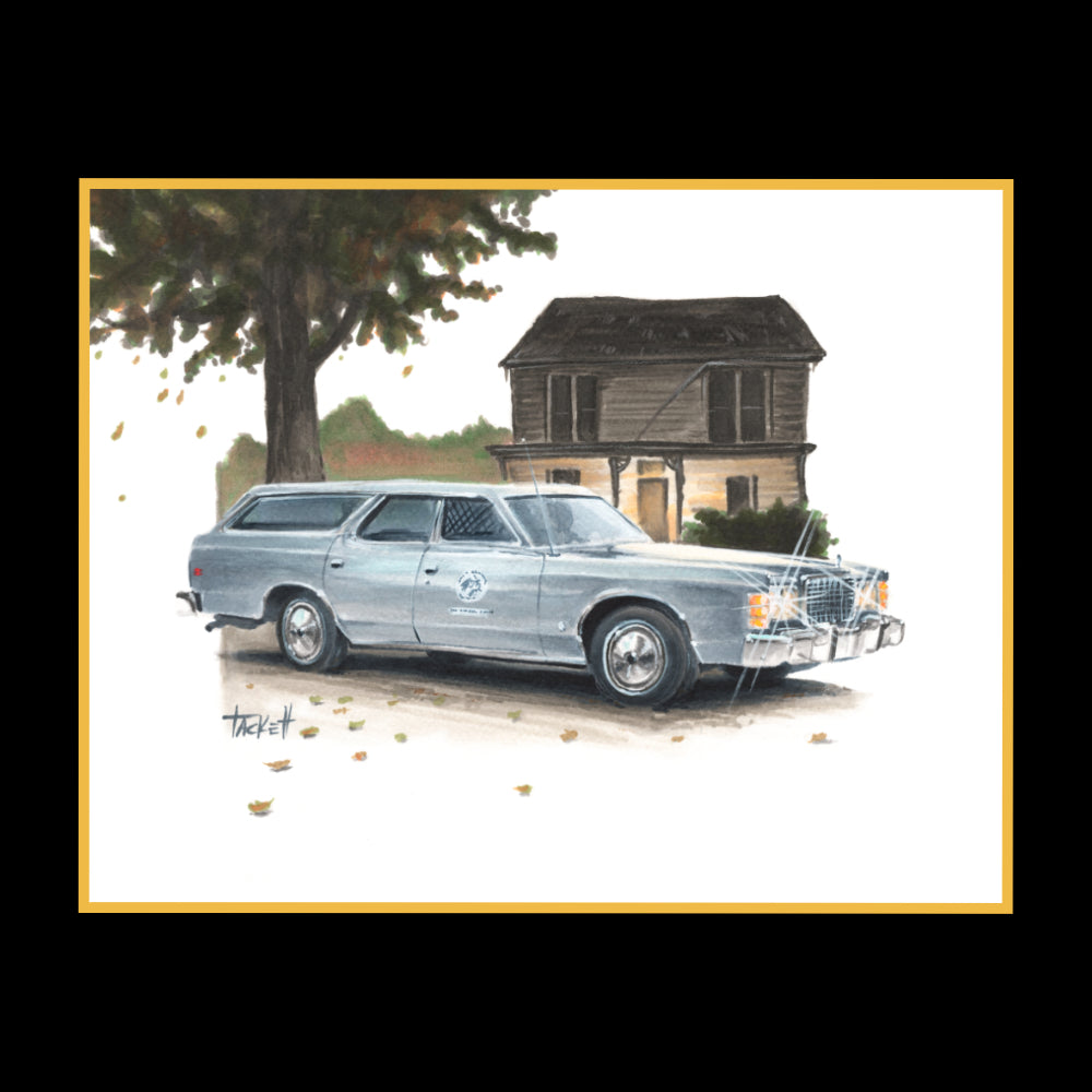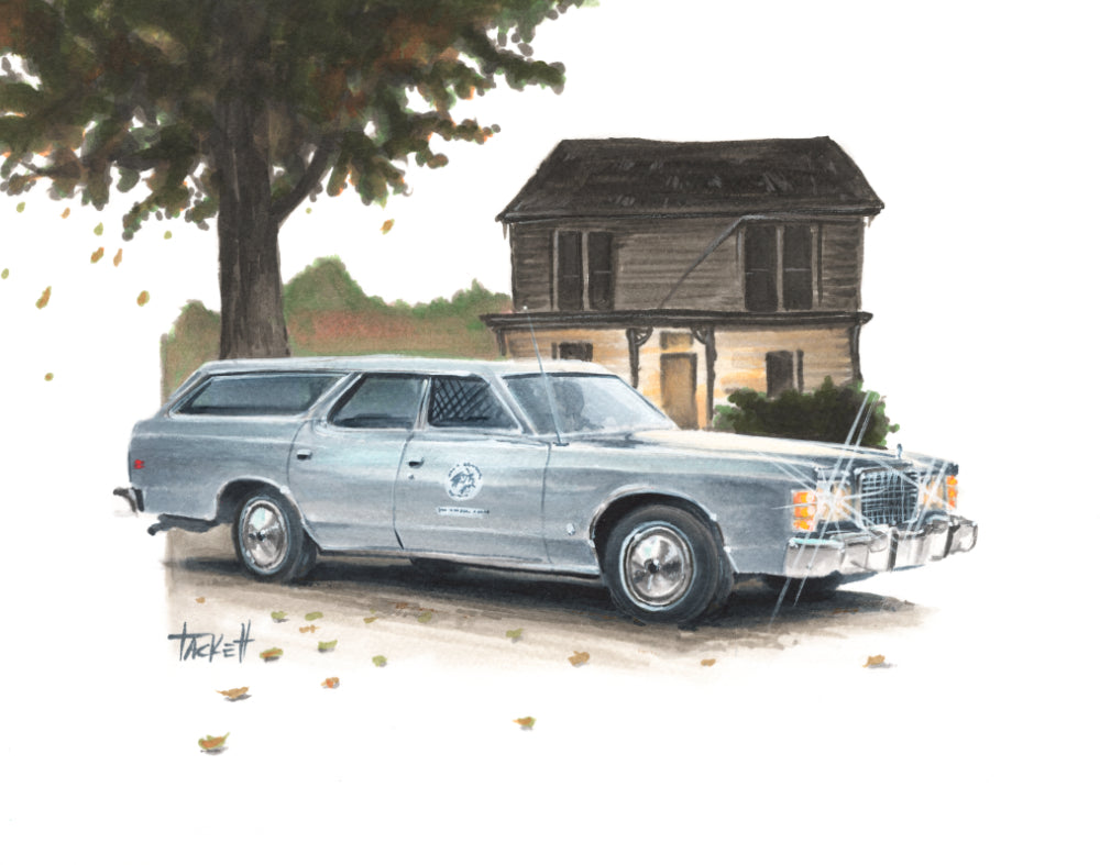 Evoke the spine-tingling suspense of Halloween night with Billy's captivating painting of the 1978 Ford LTD Wagon, famously driven by Michael Myers in the iconic film "Halloween"!