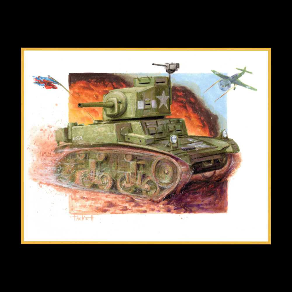 With precision and attention to detail, our artist has skillfully portrayed the M3 Stuart Light Tank, a symbol of bravery and camaraderie, as it navigates the perils of war. The painting beautifully encapsulates the essence of the legendary "Haunted Tank" and its fearless crew, poised for action.