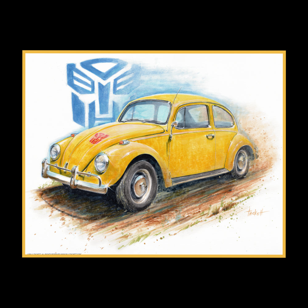 Roll out with this stunning tribute to one of the most beloved Autobots! This meticulously crafted painting features Bumblebee in his original first-generation car form, capturing every detail of the fan-favorite character. Created using markers, acrylics, and colored pencils on watercolor paper, the artwork brings the vibrant colors and classic design of the iconic Transformers hero to life. Whether you're a lifelong fan of G1 Transformers, a collector of vintage pop culture art, or simply love classic VW Beetles, this piece is a must-have addition to your collection.