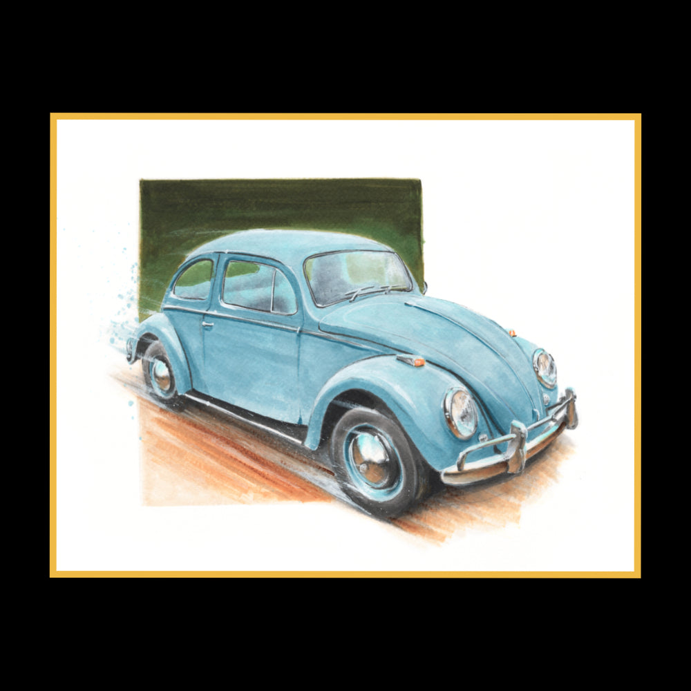 The Beetle's iconic design is beautifully rendered, capturing its vintage allure and timeless appeal. Painted on bristol board, this frame-ready print is a unique addition to any space, infusing it with the nostalgia and character of this beloved automobile.