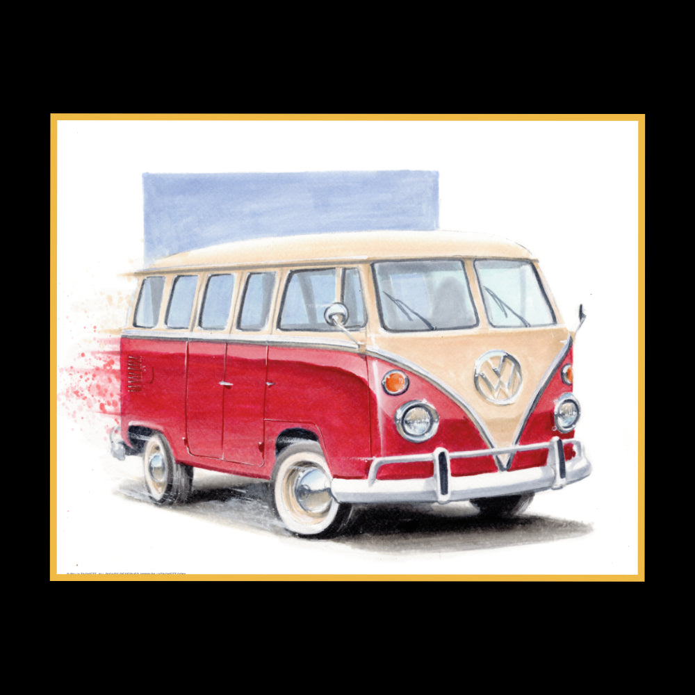 A captivating piece of art that captures the essence of freedom, adventure, and the enduring spirit of the open road—the striking painting of a red and white Volkswagen Microbus. This artwork is a vibrant celebration of an iconic vehicle that has become a symbol of counterculture and wanderlust.