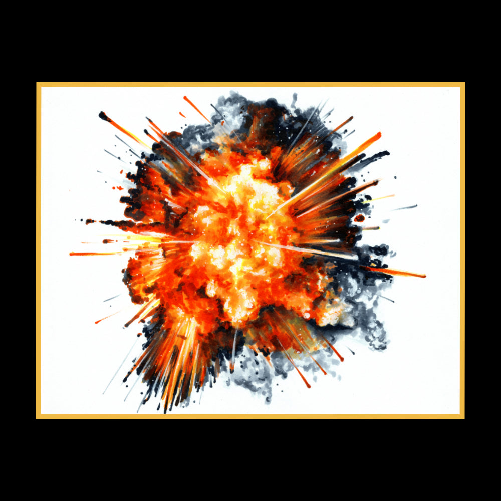 Ignite your space with the intense energy of an explosion captured in this remarkable painting by award-winning artist Billy Tackett. Against a pristine white background, Tackett's dynamic creation, crafted with a blend of markers, acrylics, and colored pencils, showcases the raw power and vivid colors of a moment frozen in time.